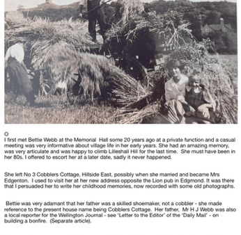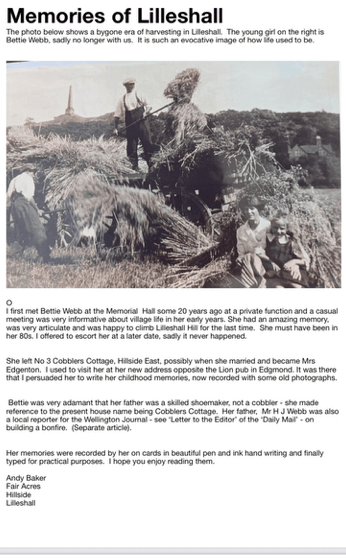 I first met Bettie Webb at the Memorial Hall some 20 years ago at a private function and a casual meeting was very informative about village life in her early years. She had an amazing memory, was very articulate and was happy to climb Lilleshall Hill for the last time. She must have been in her 80s. I offered to escort her at a later date, sadly it never happened.